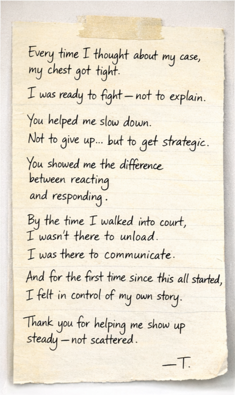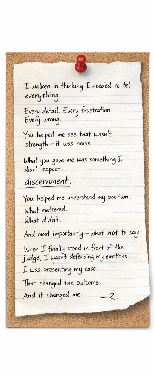 What I do is help you take what’s in your head — the facts, the timeline, the emotions — and shape it into something the court can work with.